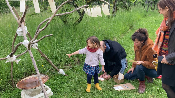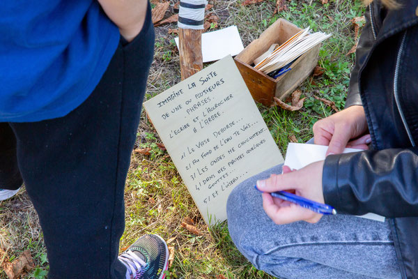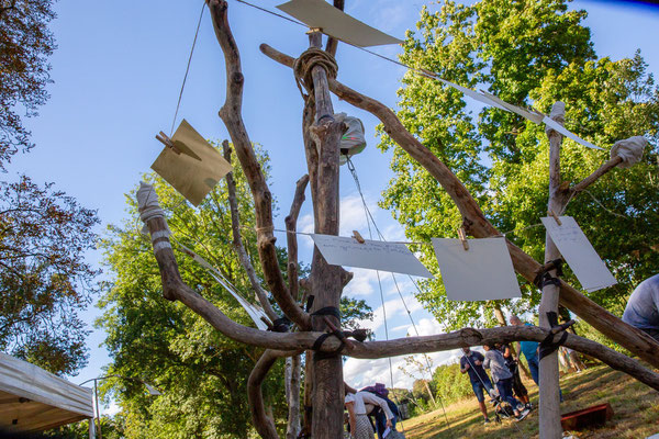 A la fin du parcours, une invitation à écrire ou dessiner ses émotions et sensations puis les accrocher sur l'arbre à mots.